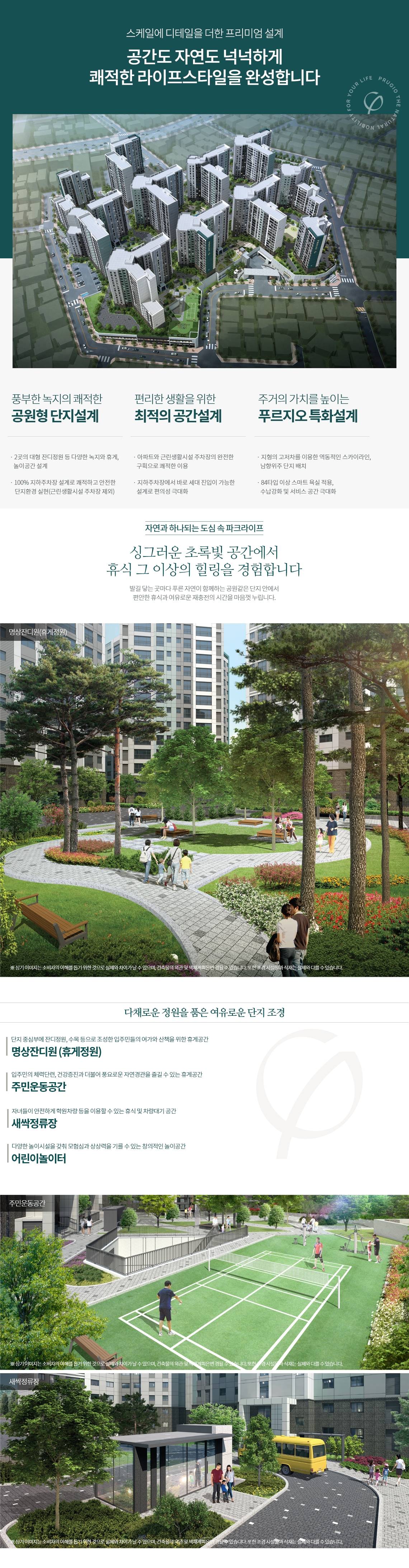 지상에 차가 없는 공원형 단지 설계와 다양한 테마 가든을 조성하여 입주민들에게 도심 속 힐링 라이프를 선사합니다.
